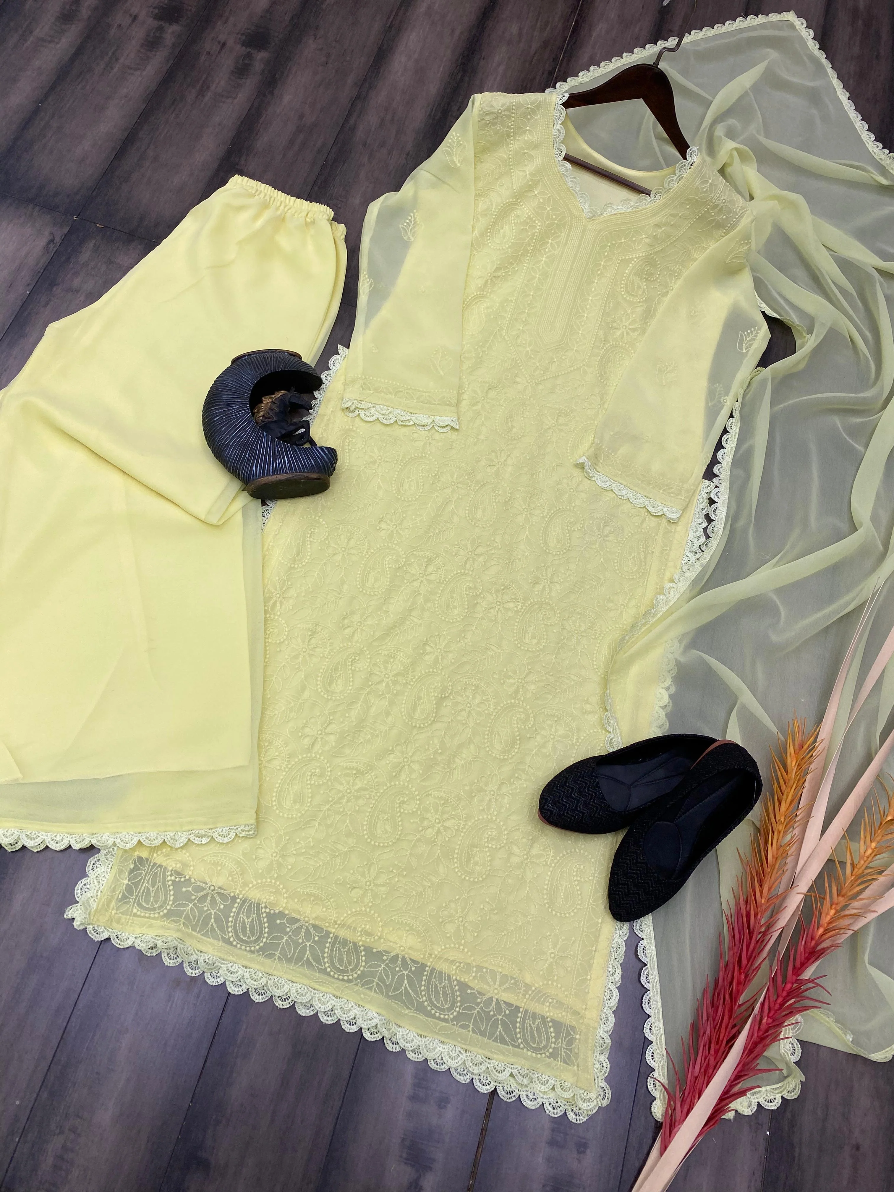 Ramani Yellow Georgette Chikankari Embroidery Kurti Set